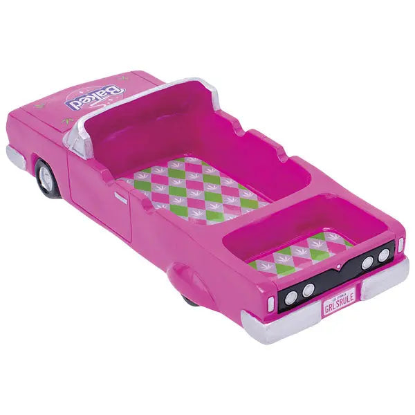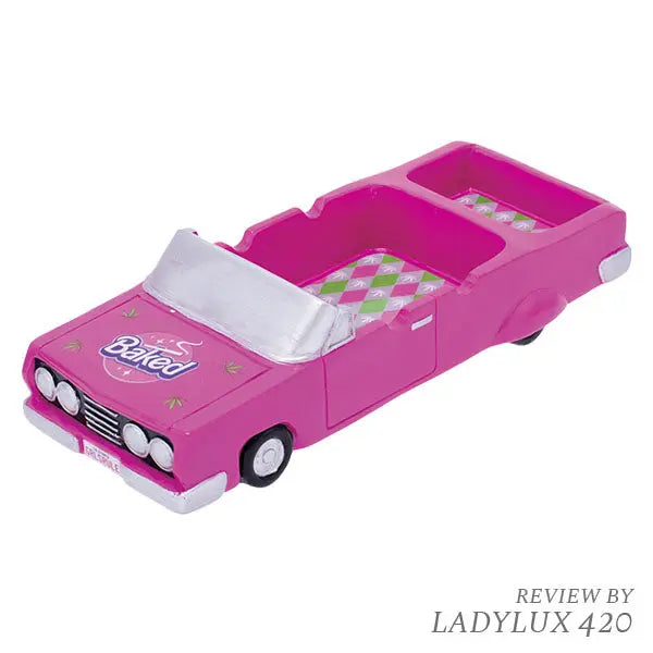 A very unique ashtray shaped to resemble Barbie's pink convertible!! Not actually barbie-themed but maybe her wayward cousin owns this lowrider automobile! Made from durable heat resistant poly-resin, bright pink in colour with an open top. 2 zones within - one larger with inbuilt rests and a smaller space in the "boot". The base is lined with felt to help keep your surfaces scratch free.