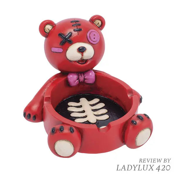 This is an ash tray made from a durable heat-resistant poly resin material. A zombie bear is the inspiration, red in colour with black, white and pink used throughout. This ashtray is in the shape of a reclining bear with, with a buttons for an eye and a cute bow tie! The bear's belly forms the ashtray and there are x3 rests built in to the perimeter.